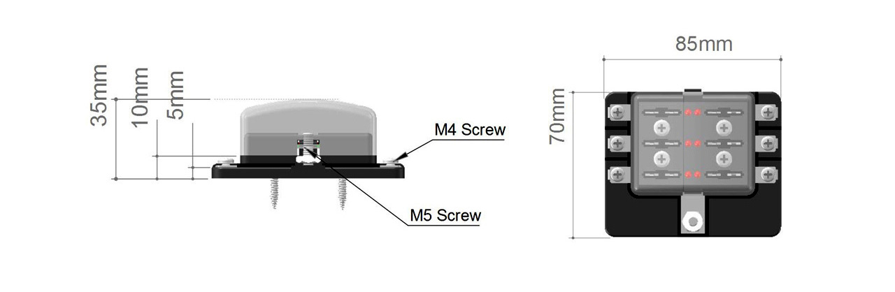 产品特点:保险丝座含有四个5.5mm螺孔,用于固定保险丝座。拥有透明的防尘防潮盖,更坚固更轻便的结构。黑色底座阻燃等级达到94V-0。