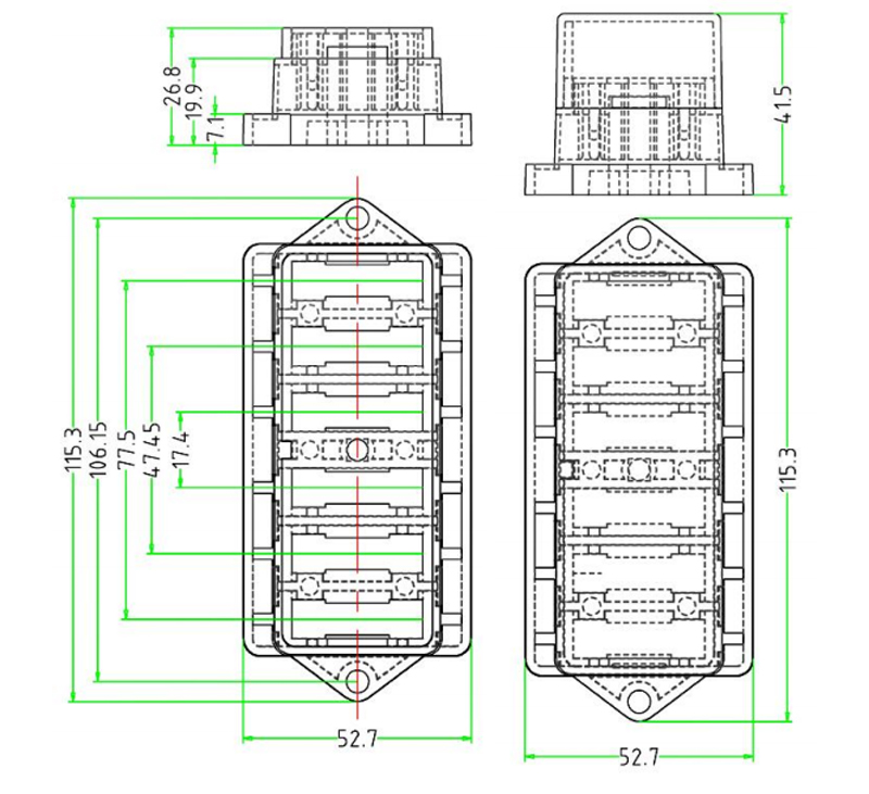 产品特点:采用高透明PC盖,能有效防尘,可以更直观的查看到保险丝的工作情况。1进1出的接线方式方便直观的连接到新的用电器。